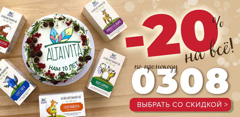 Мы благодарим Вас за то, что доверяете Алтайвита. Присоединяйтесь к нашему празднику, заказывайте любимые товары и то, что давно хотели попробовать, с выгодой 20%, наслаждайтесь травяным чаем и, пожалуйста, будьте здоровы!