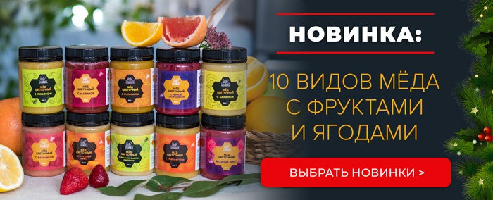 Обратите внимание на нашу новинку – целых 10 видов вкуснейшего мёда с добавлением фруктов и ягод. Достойный претендент на попадание в подарочную новогоднюю корзину! В составе только натуральный цветочный мёд и молотые ягоды и фрукты! Выбирайте любимые вкусы и балуйте своих близких полезными сладостями.