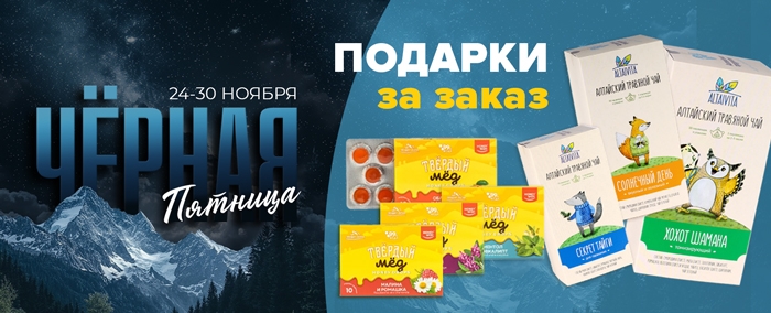 А ещё, Черная Пятница – уникальный шанс запастить подарками сразу, для всех, с выгодой! Не тратьте время в предновогодней суете, не волнуйтесь за то, что посылки не приедут вовремя – спокойно выбирайте полезности Алтая для самых любимых и экономьте время и деньги. Любимые чаи в новогодних упаковках, купажи в удобных тубусах, красочный подарочный набор – весь новогодний ассортимент уже доступен к заказу и участвует в распродаже.
