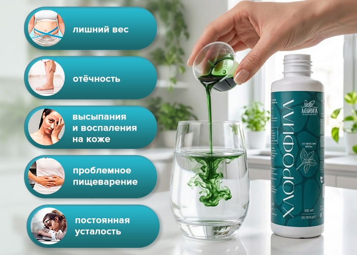 Хлорофилл — это мощный природный детокс: он эффективно очищает организм от токсинов, укрепляет иммунитет и насыщает кровь кислородом, возвращая вам естественную энергию и здоровое сияние кожи. В отличие от таблеток, жидкая форма начинает работать мгновенно, мягко нормализуя пищеварение и поддерживая кислотно-щелочной баланс.