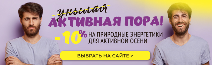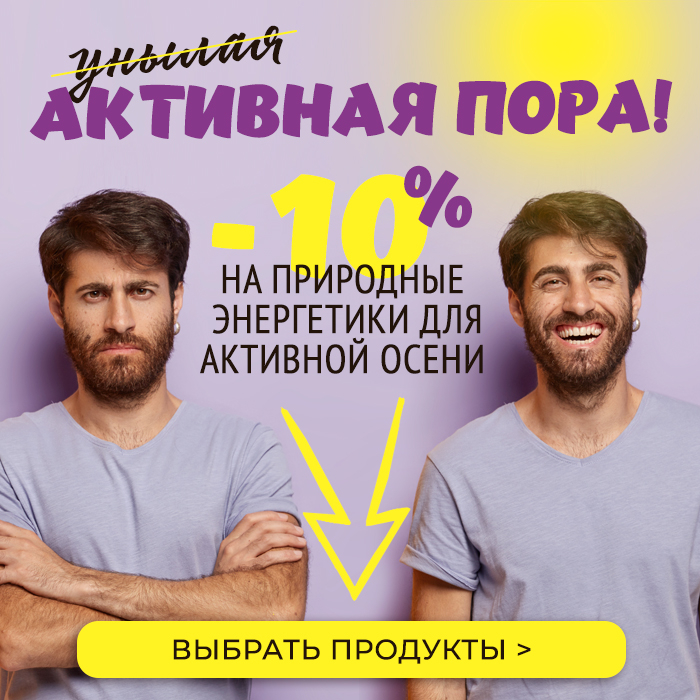 Это только малая часть всех энергетиков – в акции участвуют и травяные сборы, которые в разы полезней кофе: бодрят и витаминизируют, и популярные БАДы (гуарана, магний Б6, гинкго билоба), и безалкогольные бальзамы для активного дня и сладкого сна – переходите на сайт, заказывайте со скидкой и пусть осень будет не унылой, а самой яркой, золотой и прекрасной порой!