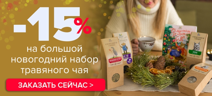 И, конечно, не забывайте, что новогодний набор чая весь декабрь можно заказать со скидкой 15%. 4 упаковки самых популярных вкусных травяных сборов в красочной коробке с авторской иллюстрацией – это универсальный подарок, который подойдет и для любителя натурального чая, и для большой семьи, и в качестве корпоративного презента.