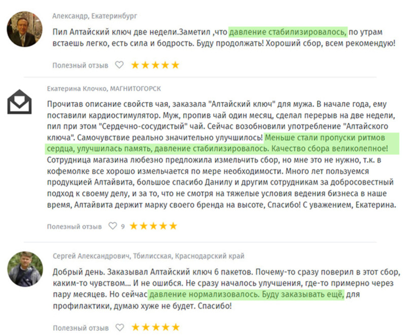 Первое, что мы советуем при проблемах с давлением, – наш авторский сбор "Алтайский ключ". За 10 лет существования его оценили десятки тысяч людей по всему миру. Вот только крошечная часть отзывов: