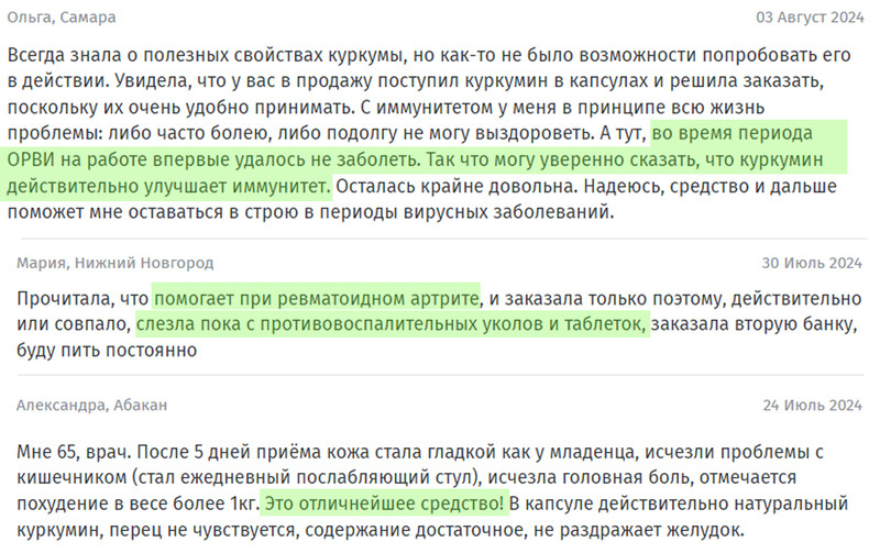 Основное свойство куркумина – противовоспалительное, также выступает он и как мощный иммуномодулятор. А в комплексе с экстрактом черного перца (пиперином) вещество усваивается практически на 100%. Вот какие отзывы о куркумине мы уже успели получить: