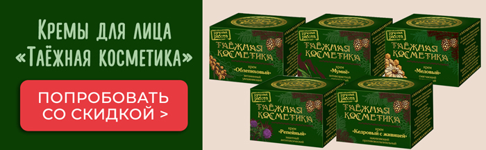 В составе всех кремов серии «Таёжная косметика» артезианская вода и кедровое масло холодного отжима, с добавлением эфирных масел, живицы, мумиё, мёда, экстрактов растений.