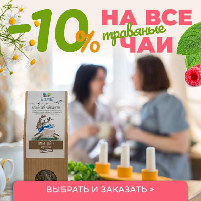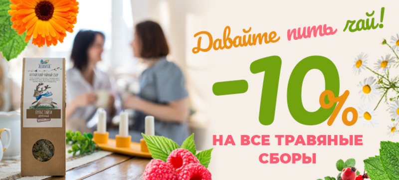 С 6 по 13 июня мы дарим скидку 10% на все сборы: и вкусные, и лечебные. Выбирайте себе, близким, в подарок, и пусть алтайские травы дарят вам удовольствие и здоровье на долгие годы!