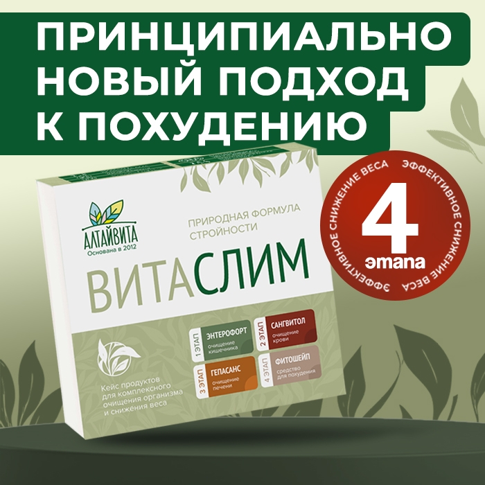 «ВИТАСЛИМ» — это не просто НАБОР, а продуманная алтайскими фитотерапевтами СИСТЕМА, которая поможет снизить вес без стресса и жестких ограничений! Она состоит из 4х растительных комплексов: